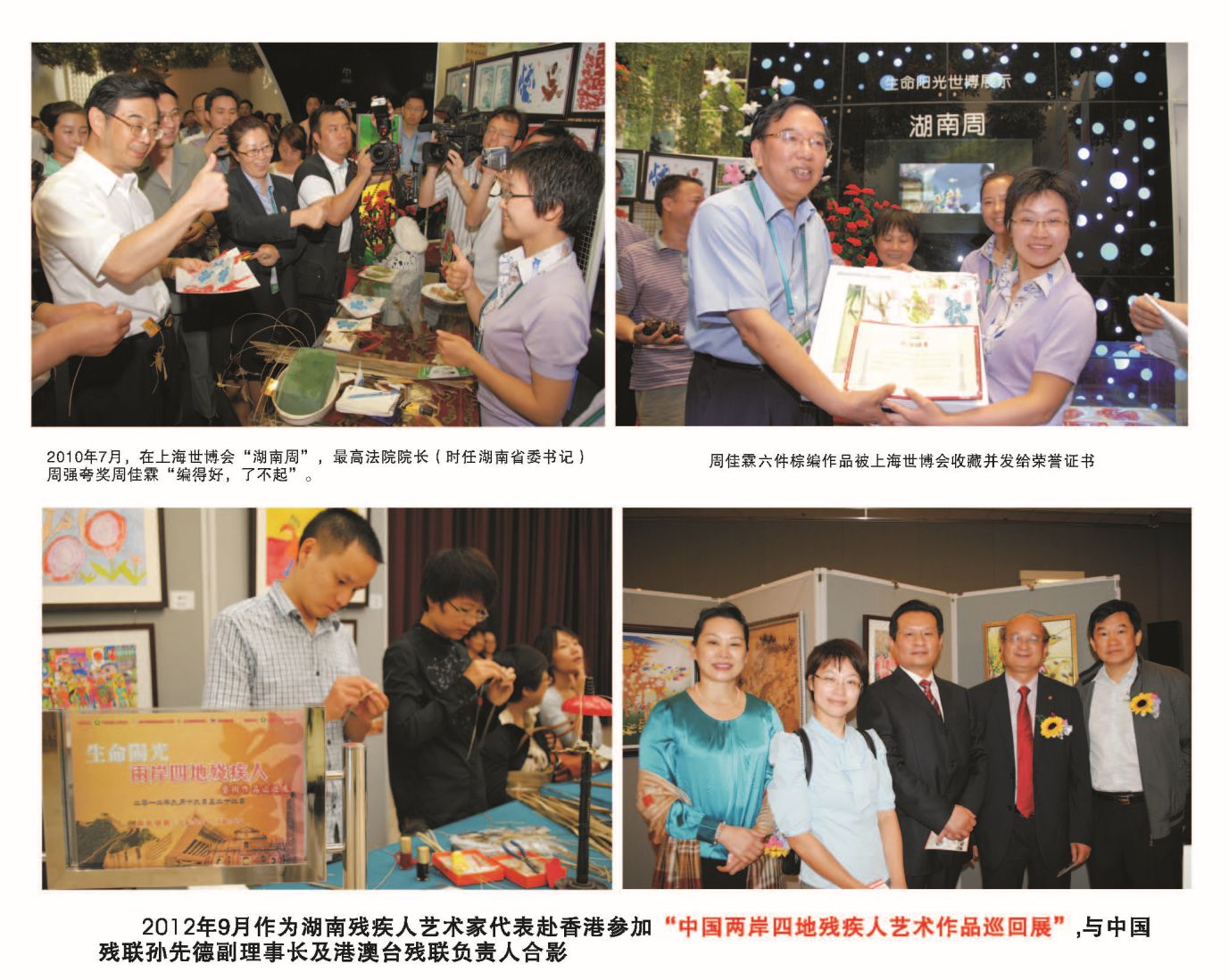 周佳霖是第三代传人,她继承传统,改革创新,第一个为棕编产品 设计精美包装,改变“裸卖”旧状况,将单个产品组合成有主题思想、 有故事、成系列的大型文创产品,成功申报四项专利,连年获得国、省、 市各级展赛20余项金银大奖,大幅度提高了产品价值。自强创办企业, 组织残疾人居家生产,使产品产业化,营销规模化。将乡土草根小玩艺 提升为国际高雅艺术,曾参加上海世博会,赴港澳欧美国际工商贸易展 览和多国进行文化交流,产品被国内外十余所博物馆、艺术机构和万千 “粉丝”收藏。